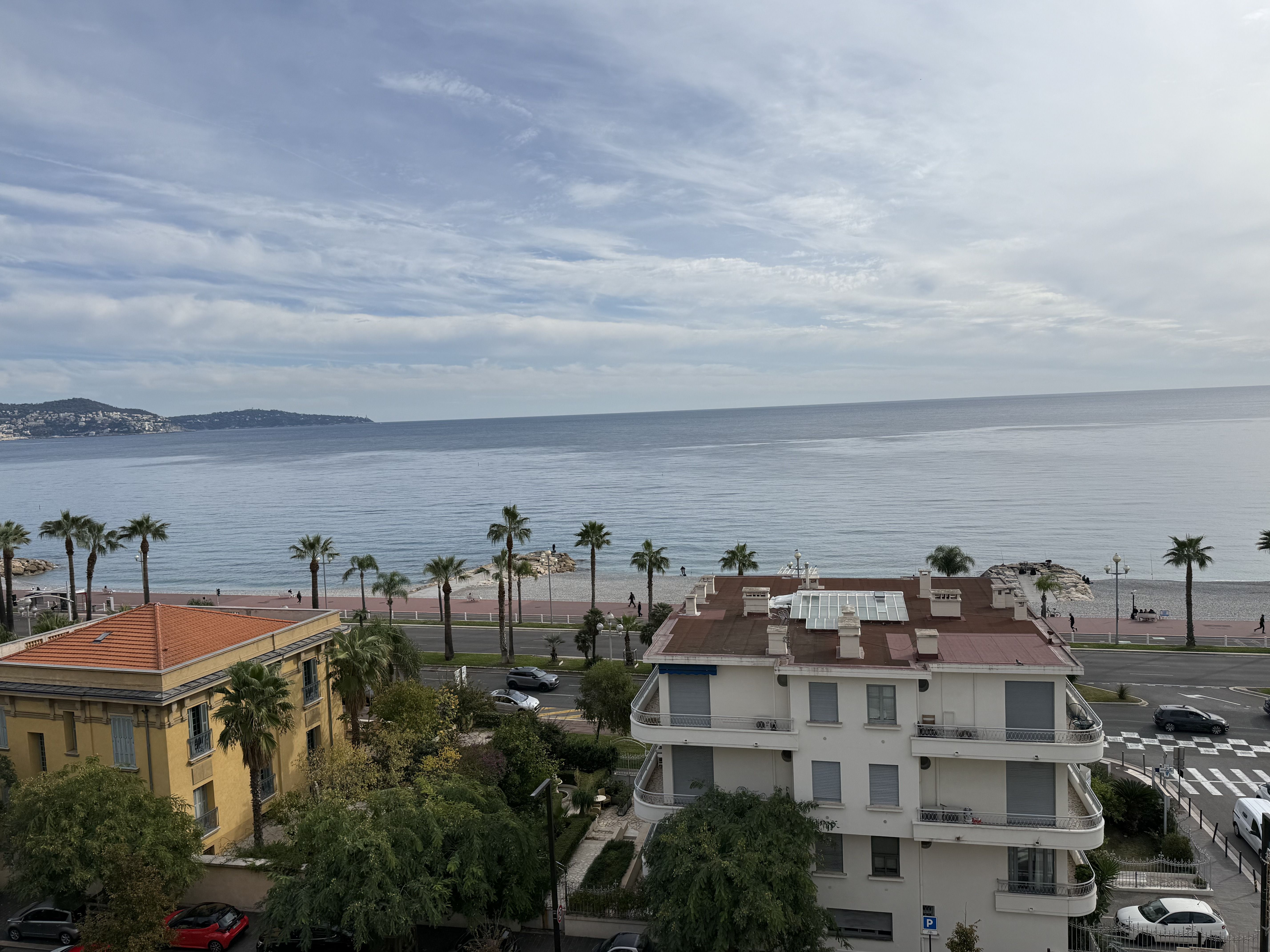 Bel appartement de 3 pièces au 6ᵉ étage avec vue mer. Comprend hall d’entrée, séjour, cuisine américaine, balcon, 2 chambres, salle de douche avec WC et WC séparé. À deux pas des plages et de la Promenade des Anglais.